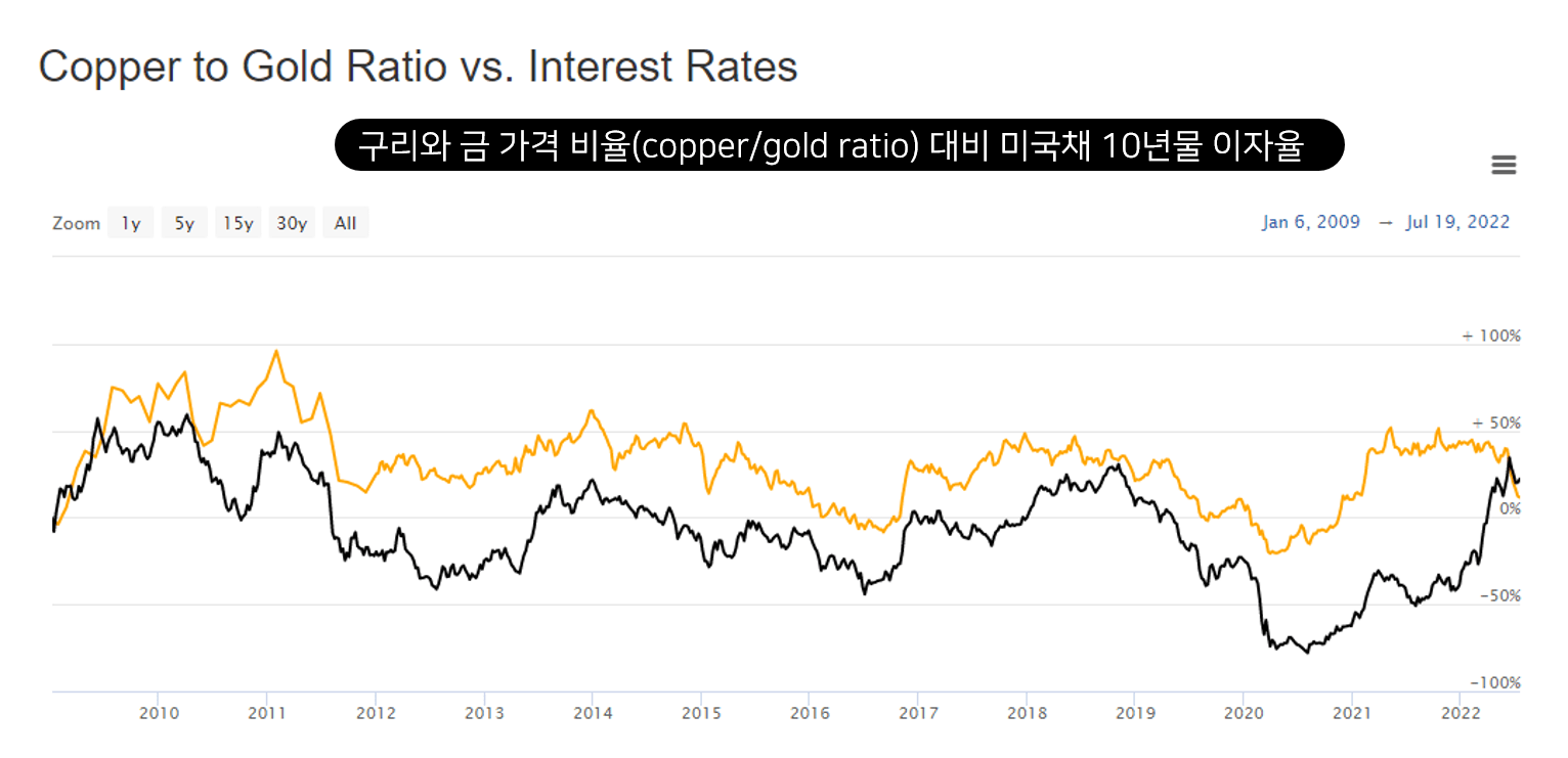 위 차트는 구리 가격을 금 가격으로 나누어서 구리와 금 가격의 비율(Copper/Gold Ratio)의 추이를 미국채 10년물 금리와 비교한 차트입니다. 노란색선이 구리와 금 가격 비율선입니다.