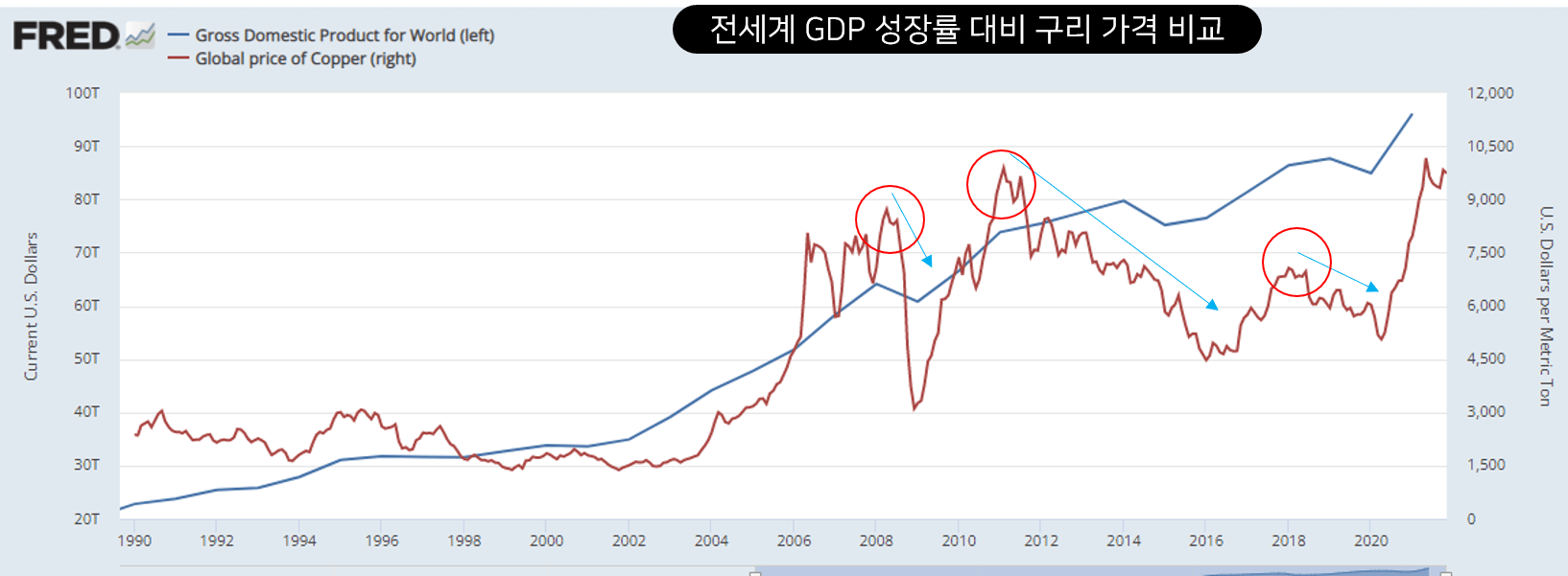 전세계 모든 국가의 총생산을 더한 GDP는 꾸준히 우상향을 하고 있는 모습입니다. 세계 경제의 성장과 함께 구리 가격 또한 가파른 상승세를 보여왔습니다. 글로벌 경제 성장과 함께 구리 가격 또한 급등한 것을 볼 수 있습니다.