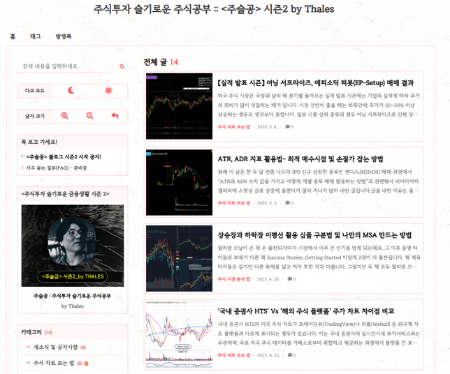 최근까지 매일 미장 매매 종목은 주식 차트 패턴 및 셋업은 물론 리스크 관리와 핸들링에 공부가 좀 되었으면 하는 마음에서 비정기적이나마 꾸준히 포스팅을 하고 있습니다. 바이미커피 플랫폼 사이트 대부분의 글은 공개로 작성을 하고 있으니, 관심있는 분들은 갤러리 및 포스트 게시판에 올린 최근 매매종목 및 시장 트렌드 리딩 및 주식 공부 방법에 관한 자잘한 팁을 배우고 익힐 수 있습니다.