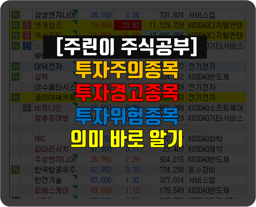 따라서 그 결과로 주식 종목명 앞에 "신, 증, 정, 열, 관, 환, 위, 경, 주" 같은 경고 표시를 부여해 따로 분류하도록 하고 있습니다.